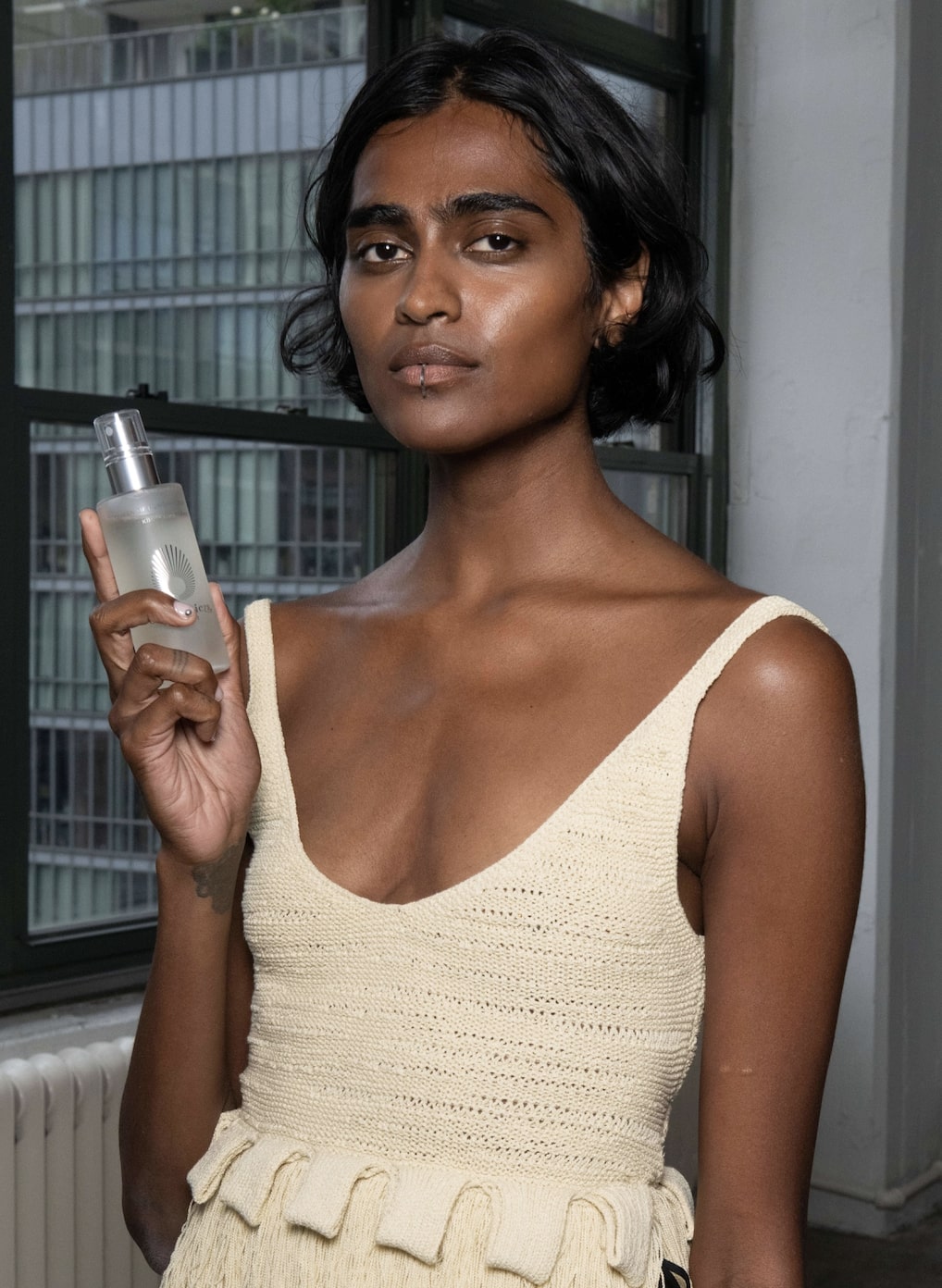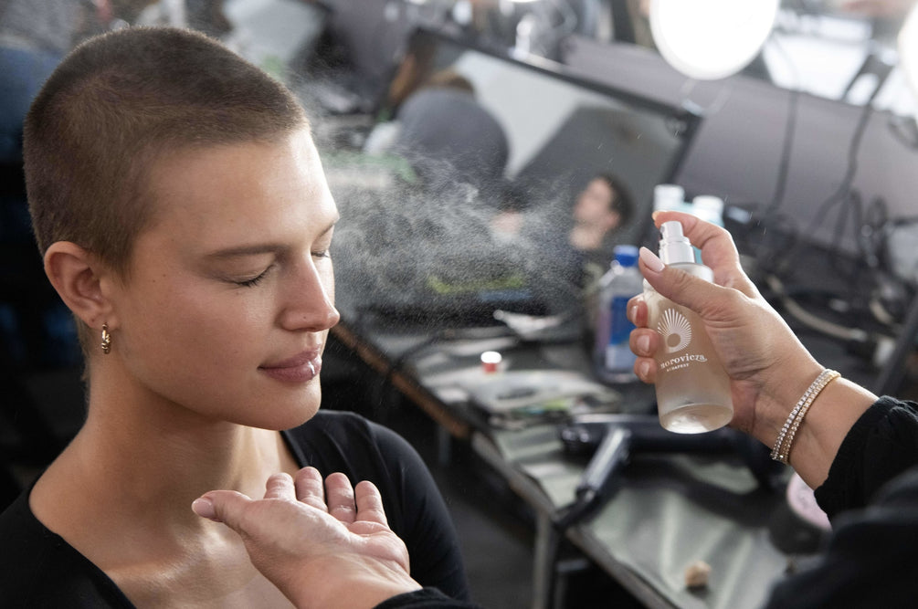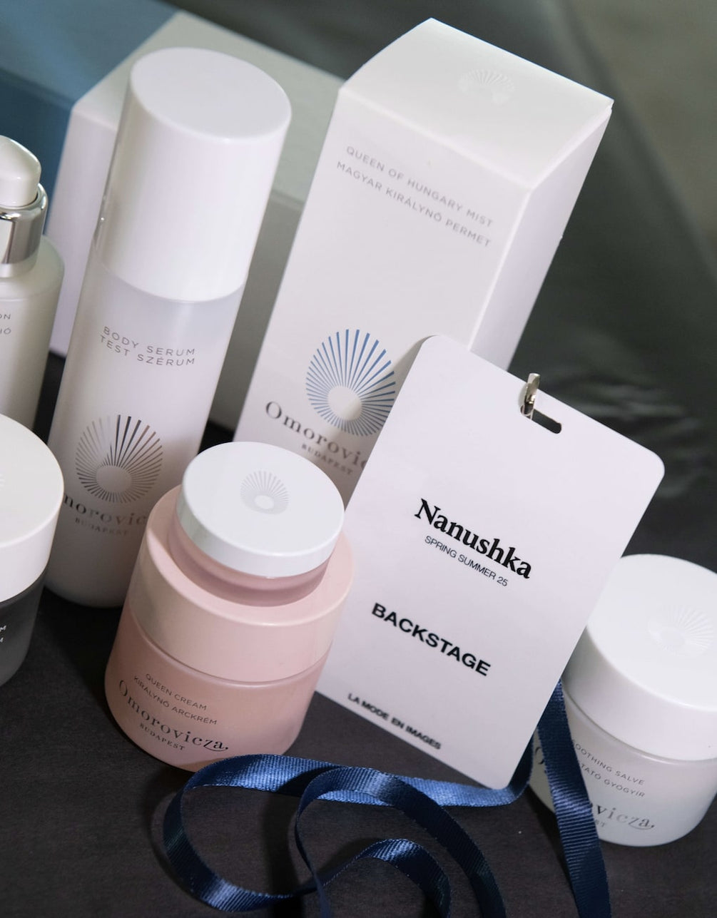 The signature look of the Nanushka SS25 presentation was all about glowing, healthy skin, thanks to Omorovicza’s expert formulations and techniques inspired by ancient Hungarian therapies. Backstage, Omorovicza’s Head Therapist, Erin Pulley, led the skincare preparation, performing a series of treatments designed to prime and plump each model’s skin before makeup application.