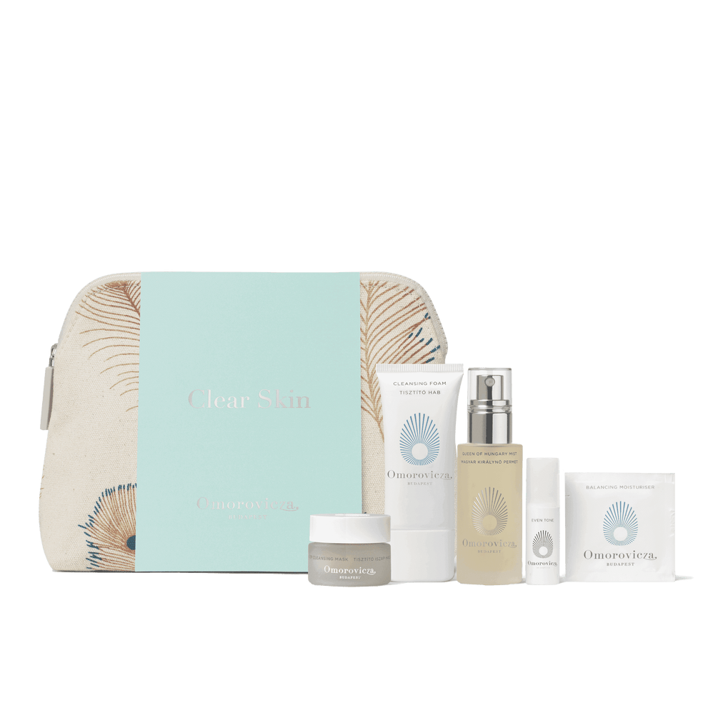 Clear skin and balance sebum with the Clear Skin Kit, a full routine of minis in a limited-edition travel pouch, created for blemish-prone and oilier skin types. With a cleanser, a daily serum, a treatment, a moisturizer and Omorovicza’s iconic mist, this set focuses on shine control, pore refining and skin tone correction, for a decongested, even, healthy complexion.