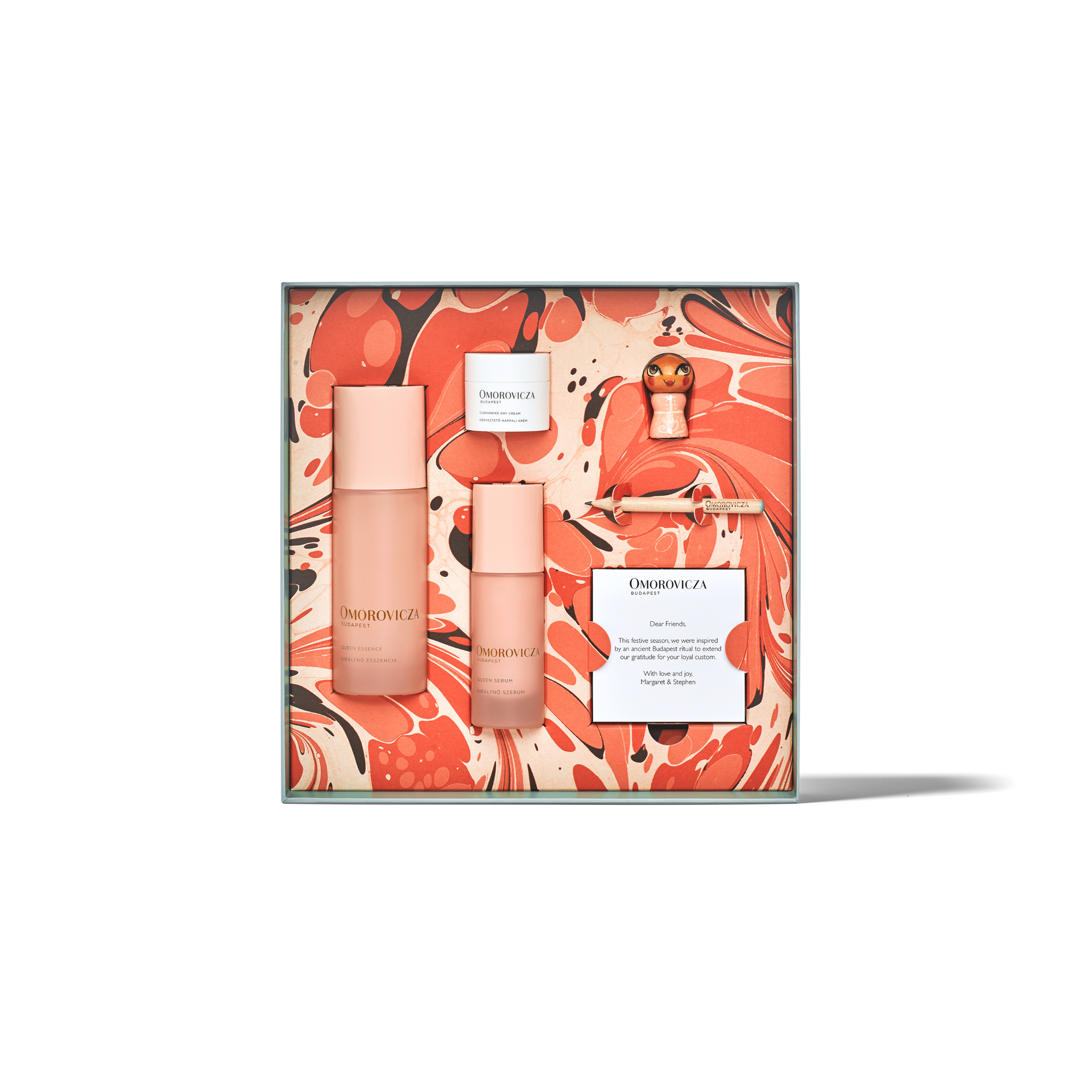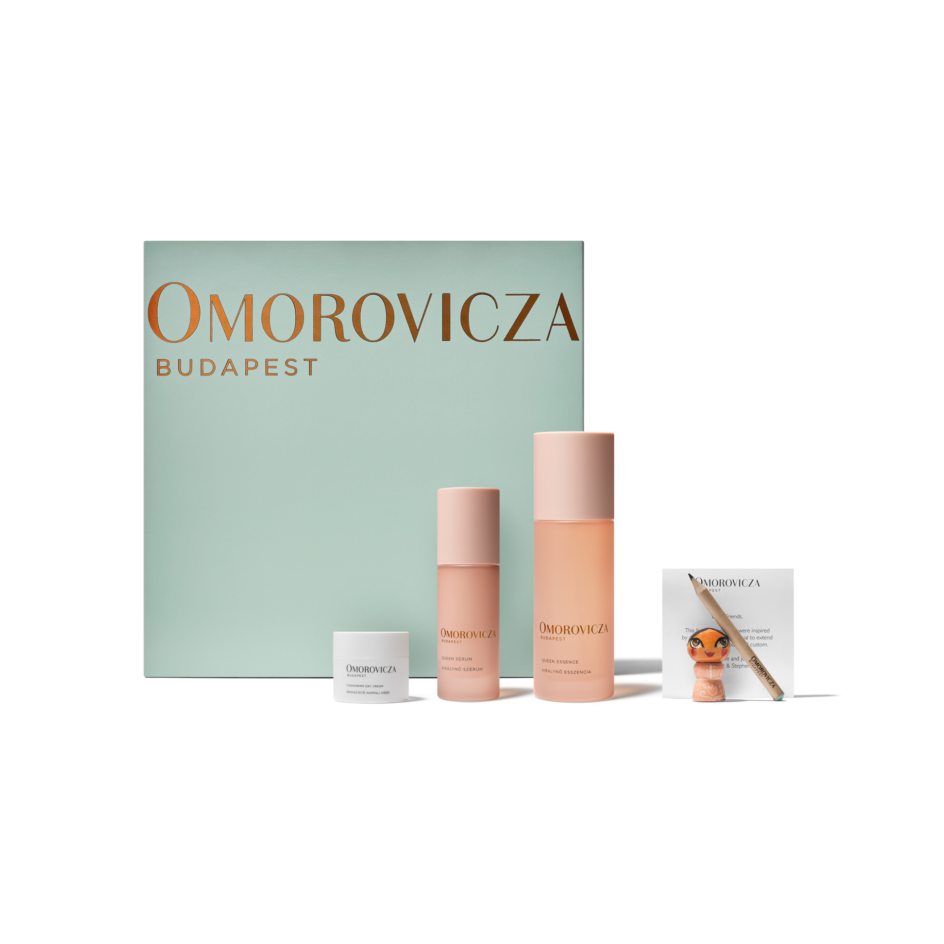 Queen Serum: Aqua (Water), Glycerin, Aqua (Hungarian Thermal Water), Saccharomyces (Hungarian Thermal Water) Ferment Extract, Triheptanoin, C13-16 Isoalkane, Olive Oil Decyl Esters, Caprylic/Capric Triglyceride, Squalane, Cetearyl Olivate, Sorbitan Olivate, Cetearyl Alcohol, Benzyl Alcohol, Lithops Pseudotruncatella Callus Lysate, Sodium Hyaluronate, Propanediol, Phospholipids, Sodium Benzoate, Potassium Sorbate, Parfum (Fragrance), CI 77891 (Titanium Dioxide), Squalene, Carbomer, Algae Oligosaccharides, Salicylic Acid, Synthetic Fluorphlogopite, Sodium Hydroxide, Aluminium Oxide, Tocopherol, Leuconostoc/Radish Root Ferment Filtrate, Pentylene Glycol, Xanthan Gum, Engelhardtia Chrysolepis Leaf Extract, Sorbic Acid, Xanthophylls, Lecithin, CI 77491 (Iron Oxides), Cyamopsis Tetragonoloba (Guar) Gum, Silica, Tin Oxide, Phytic Acid, Lactic Acid, Palmitoyl Tetrapeptide-7, Citronellol, Geraniol, Linalool, Limonene. Queen Essence: Aqua (Water), Pentylene Glycol, Propanediol, Aqua (Hungarian Thermal Water), Glycerin, 2,3-Butanediol, Saccharomyces (Hungarian Thermal Water) Ferment Extract, Ethylhexylglycerin, Chondrus Crispus Powder (Carrageenan), Xanthan Gum, Caprylyl/Capryl Glucoside, Phospholipids, Sodium Hyaluronate, Glucose, Rosa Damascena Extract, Gluconolactone, Tremella Fuciformis (Mushroom) Extract, Lactic Acid, Leuconostoc/Radish Root Ferment Filtrate, Sodium Benzoate, Solanum Lycopersicum (Tomato) Leaf Cell Culture Extract, Decyl Alcohol, Calcium Gluconate, Citronellol, Geraniol.