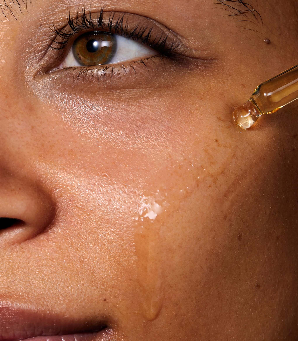 Model applying Miracle Facial Oil to her face with a pipette. The skin where the product has been applied look glowy and hydrated.