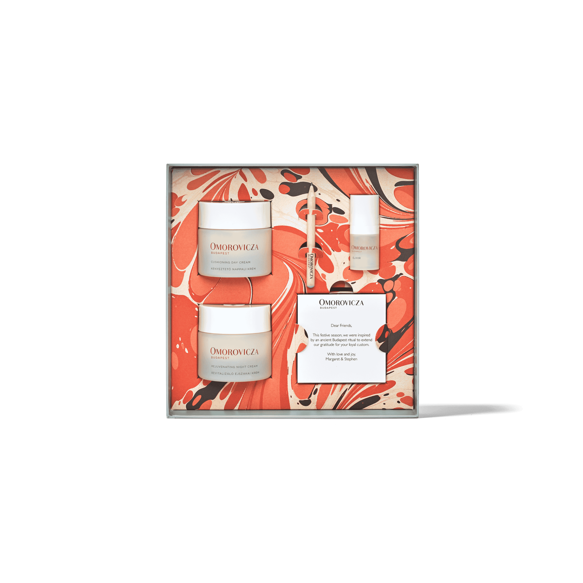 Rejuvenating Night Cream: Aqua (Hungarian Thermal Water), Glycerin, Butyrospermum Parkii (Shea Butter), Simmondsia Chinensis (Jojoba) Seed Oil, Squalane, Caprylic/Capric Triglyaceride, Cetearyl Ethylhexanoate, Prunus Domestica Seed Extract, Cetearyl Olivate, Stearyl Heptanoate, Sorbitan Olivate, Cetearyl Alcohol, Hydrolyzed Hazelnut Protein, Saccharomyces (Hungarian Thermal Water) Ferment Extract, Cera Alba (Beeswax), Phenoxyethanol, Mannitol, Sodium Lactate, Malpighia Punicifolia (Acerola) Fruit Extract, Prunus Armeniaca (Apricot) Kernel Oil, Xanthan Gum, Disodium EDTA, Pyrus Malus (Apple) Fruit Extract, Helianthus Annuus (Sunflower) Seed Oil, Tocopherol, Ethylhexylglycerin, Parfum (Fragrance), Phospholipids, Chlorella Vulgaris/ Lupinus Albus Protein Ferment, Pectin, Yeast Extract, Linalool, Geraniol, Potassium Sorbate, Beta-Carotene, Daucus Carota Sativa (Carrot) Root Extract, Daucus Carota Sativa (Carrot) Seed Oil, Cinnamyl Alcohol, Ascorbyl Palmitate. Cushioning Day Cream: Aqua (Water), Coco-Caprylate/Caprate, Glycerin, Saccharomyces (Hungarian Thermal Water) Ferment Extract, Dicaprylyl Carbonate, C10-18 Triglycerides, C12-16 Alcohols, Prunus Amygdalus Dulcis (Sweet Almond) Oil, Triheptanoin, Helianthus Annuus (Sunflower) Seed Oil, Stearyl Heptanoate, Bentonite, Glyceryl Stearate Citrate, Palmitic Acid, Sodium Levulinate, Sodium Stearoyl Glutamate, Hydrogenated Lecithin, Cetyl Alcohol, Xanthan Gum, C9-12 Alkane, Stearyl Caprylate, Dilinoleic Acid/Butanediol Copolymer, Phospholipids, Jojoba Esters, Ethylhexylglycerin, Parfum (Fragrance), Sodium Anisate, Helianthus Annuus (Sunflower) Seed Wax, Sorbitan Caprylate, Leuconostoc/Radish Root Ferment Filtrate, Tocopherol, Phytic Acid, Plankton Extract, Acacia Decurrens Flower Wax, Polyglycerin-3, Castor Oil/IPDI Copolymer, Alteromonas Ferment Extract, Phenethyl Alcohol, Cistus Incanus Flower/Leaf/Stem Extract, Phenylpropanol, 1,2-Hexanediol, Linalool, Benzyl Salicylate, Citronellol, Limonene, Geraniol.