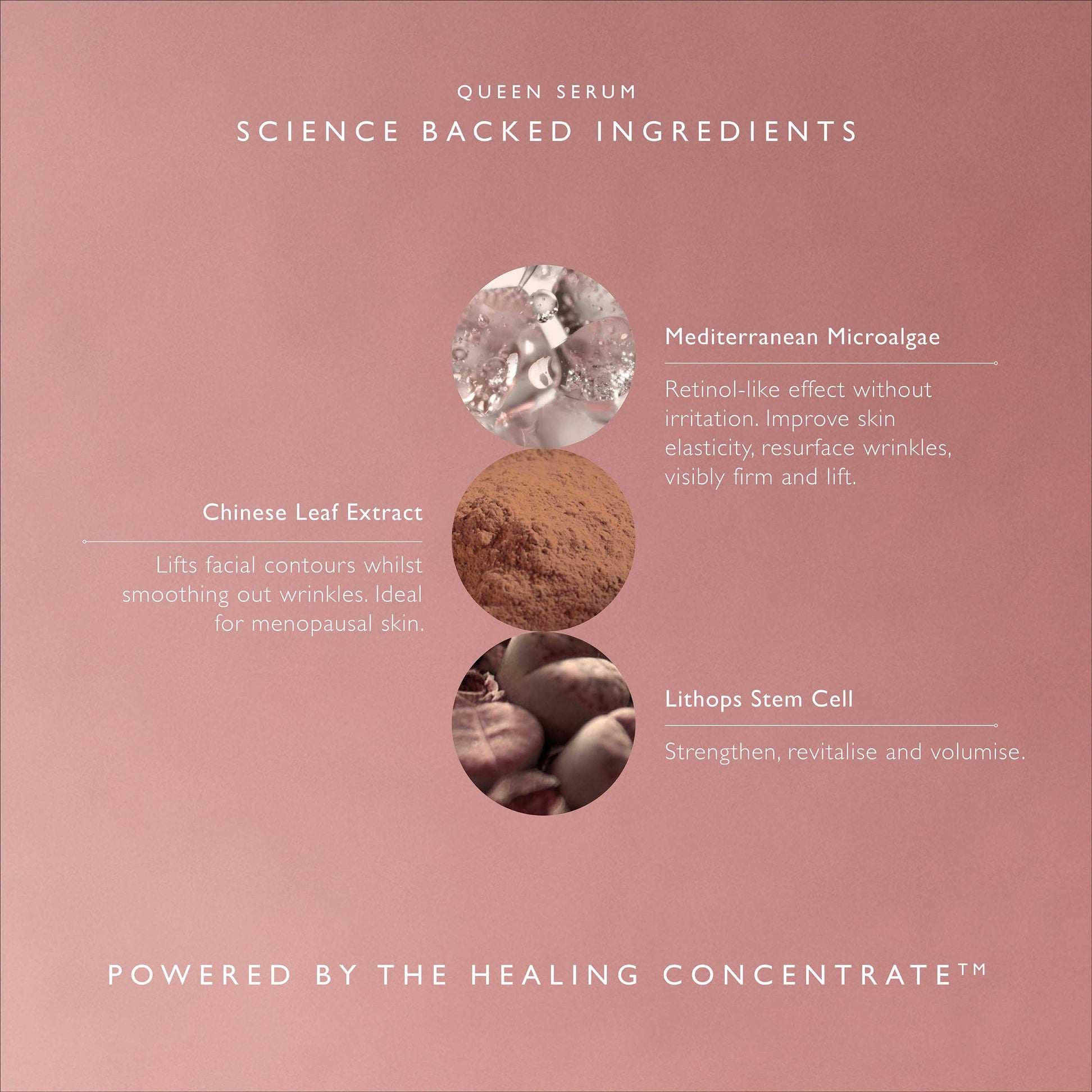 Clinically proven to reduce wrinkle depth in just 30 minutes, Queen Serum delivers transformative results for a firmer, lifted and radiant complexion. Harnessing the power of retinoid Mediterranean Microalgae for a retinol-like effect without irritation, this non-sensitising formula is ideal for all skin types, including sensitive and menopausal skin. Lithops Stem Cells, known for their regenerative properties, work to strengthen and volumise, while Chinese Leaf Extract helps lift and smooth.